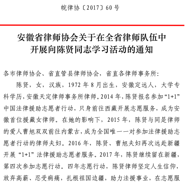 關(guān)于轉(zhuǎn)發(fā)《安徽省律師協(xié)會關(guān)于在全省律師隊伍中開展向陳賢同志學(xué)習(xí)活動的通知》的通知