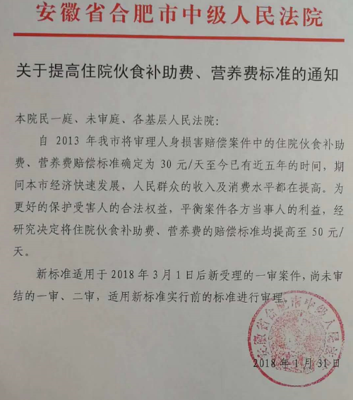 安徽省合肥市中級人民法院關(guān)于提高住院伙食費、營養(yǎng)費標準的通知