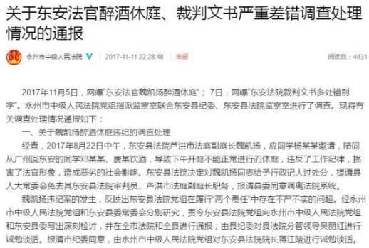 11月11日晚10時28分,湖南永州市中級人民法院官方微博通報該市東安縣人民法院法官魏凱揚醉酒致休庭事件的處理情況:“東安縣法院決定對魏凱揚同志給予行政記大過處分,提請縣人大常委會免去其東安縣法院審判員、蘆洪市法庭副庭長職務,報請縣委同意調(diào)離法院系統(tǒng)。”