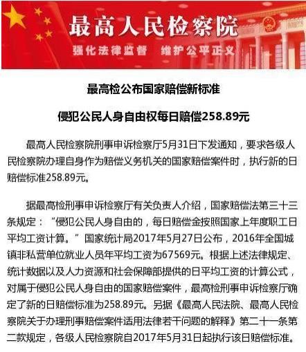 據(jù)最高檢刑事申訴檢察廳有關(guān)負(fù)責(zé)人介紹,國(guó)家賠償法第三十三條規(guī)定:“侵犯公民人身自由的,每日賠償金按照國(guó)家上年度職工日平均工資計(jì)算?!眹?guó)家統(tǒng)計(jì)局2017年5月27日公布,2016年全國(guó)城鎮(zhèn)非私營(yíng)單位就業(yè)人員年平均工資為67569元。根據(jù)上述法律規(guī)定、統(tǒng)計(jì)數(shù)據(jù)以及人力資源和社會(huì)保障部提供的日平均工資的計(jì)算公式,對(duì)屬于侵犯公民人身自由的國(guó)家賠償案件,最高檢刑事申訴檢察廳確定了新的日賠償標(biāo)準(zhǔn)為258.89元。另?yè)?jù)《最高人民法院、最高人民檢察院關(guān)于辦理刑事賠償案件適用法律若干問(wèn)題的解釋》第二十一條第二款規(guī)定,各級(jí)人民檢察院自2017年5月31日起執(zhí)行該日賠償標(biāo)準(zhǔn)。
