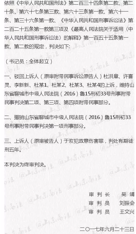 2017年2月17日,山東聊城中院一審以故意傷害罪判處于歡無期徒刑,經(jīng)媒體報道后引發(fā)社會關注。宣判后,被告人于歡、附帶民事訴訟原告人杜洪章、許喜靈、李新新等人不服,提出上訴。