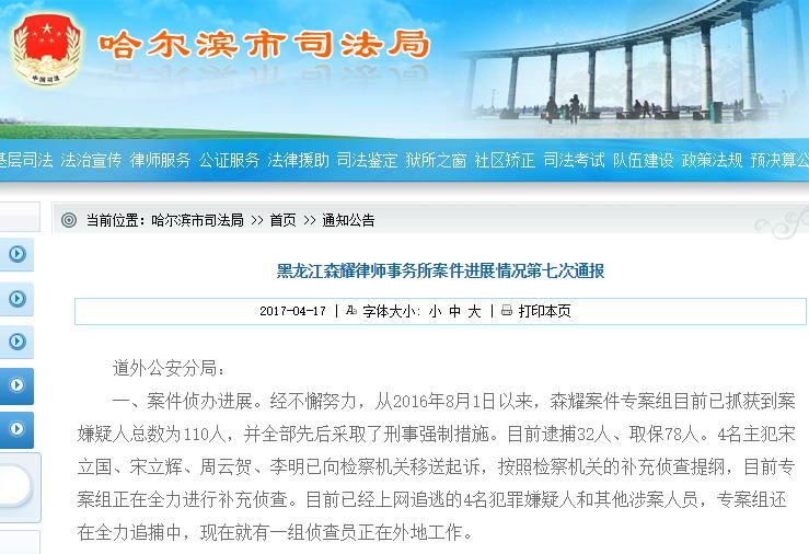 截至目前,公安機(jī)關(guān)陸續(xù)以涉嫌詐騙罪、虛假廣告罪、妨害公務(wù)罪向檢察機(jī)關(guān)移送起訴森耀案犯罪嫌疑人109人。其中,市檢察院負(fù)責(zé)辦理森耀律師事務(wù)所實(shí)際控制人宋立國等4名犯罪嫌疑人,已于2017年3月24日依法退回公安機(jī)關(guān)補(bǔ)充偵查;其余105名犯罪嫌疑人由道外區(qū)檢察院負(fù)責(zé)辦理,目前正在審查中。
