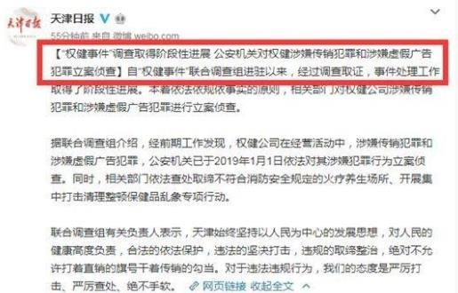 據(jù)聯(lián)合調(diào)查組介紹,經(jīng)前期工作發(fā)現(xiàn),權(quán)健公司在經(jīng)營活動(dòng)中,涉嫌傳銷犯罪和涉嫌虛假廣告犯罪,公安機(jī)關(guān)已于2019年1月1日依法對(duì)其涉嫌犯罪行為立案偵查。同時(shí),相關(guān)部門依法查處取締不符合消防安全規(guī)定的火療養(yǎng)生場所、開展集中打擊清理整頓保健品亂象專項(xiàng)行動(dòng)。