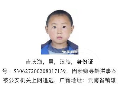 記者發(fā)現(xiàn),排在第24位的在逃犯罪嫌疑人叫吉慶海,男,漢族,身份證號:53062720020801xxxx,因涉嫌尋釁滋事案被公安機(jī)關(guān)上網(wǎng)追逃,戶籍地址:云南省鎮(zhèn)雄縣場壩鎮(zhèn)麻塘村民委員會雙石村小組33號。警方配發(fā)照片時,用的是一張其兒童時期的照片。