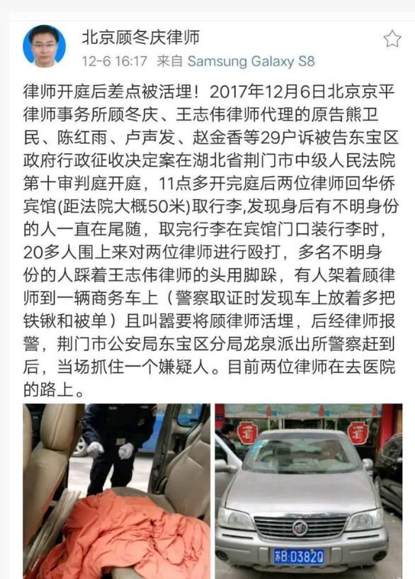 事實(shí)上,剛出法院門口,他們就已經(jīng)被一群不明身份人員尾隨跟蹤,人數(shù)多大20人,這群人在賓館門口堵住了王志偉和顧冬慶,隨即一群人分成兩撥,一撥人把王志偉律師摁倒在地,亂腳跺頭,另一撥人則把顧冬慶律師駕到一輛商務(wù)車上,揚(yáng)言要把顧律師活埋。